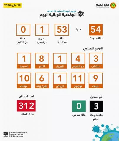 البشام الإخباري / أعلن اليوم في نوكشوط عن تسجيل  54 حالة إصابة  بفيروس كورونا  خلال 24  ساعة الماضية وذلك حسب معطيات المؤتمر الصحفي المسائي الذي قدمه منسق مكافحة فيروس كورونا مدير الصحة العمومية د / سيد ولد الزحاف  وكانت النتائج على النحو التالي /