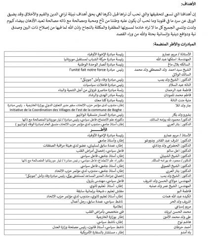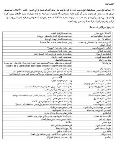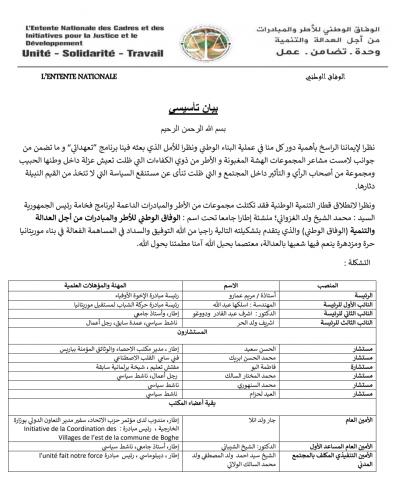 ونظرا لانطلاق قطار التنمية الوطنية فقد تكتلت مجموعات من الأطر والمبادرات الداعمة لبرنامج فخامة رئيس الجمهورية السيد : محمد الشيخ ولد الغزواني؛ منشئة إطارا جامعا تحت اسم : الوفاق الوطني للأطر والمبادرات من أجل العدالة والتنمية (الوفاق الوطني) والذي يتقدم بتشكيلته التالية راجيا من الله التوفيق والسداد في المساهمة الفعالة في بناء موريتانيا حرة ومزدهرة ينعم فيها شعبها بالعدالة، معتصما بحبل الله آمنا مطمئنا بحول الله.