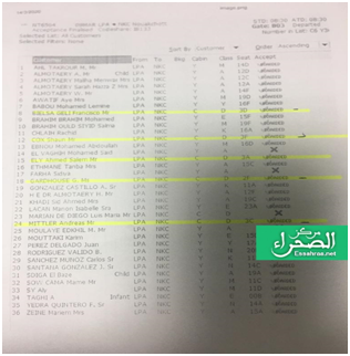اللائحة المرفقة تظهر قائمة الركاب مع إشارة باللون الأصفر لتمييز من كانوا يجلسون على المقاعد القريبة من الرجل. الذي وصل مطار نواكشوط مساء الاثنين 9 مارس على متن رحلة قادمة من إسبانيا.