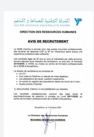 البشام الإخباري/ أعلنت الشركة الوطنية للصناعة والمناجم اسنيم عن أكتتاب جديد لصالح الميكانكيين فقط الحاصلين علي شهادة CAP و BT ميكانيك وان لا يزيد عمر المترشح علي 30سنة.