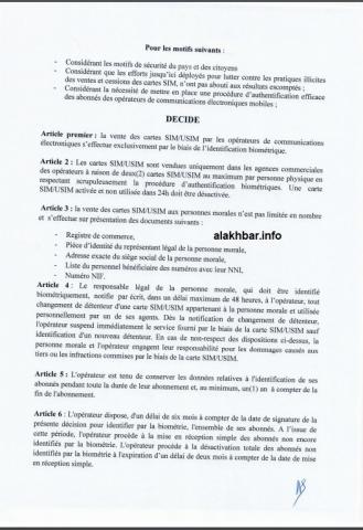 كما ألزمتهم بأن تباع بطاقات الشرائح فقط في الوكالات التجارية لمشغلي الاتصالات، بمعدل بطاقتين على الأكثر للشخص مع الاحترام الدقيق لإجراء تحديد الهوية البيومترية.