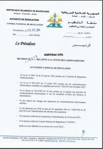 وألزمت السلطة في قرار صادر عنها شركات الاتصالات الثلاث (ماتل - موريتل - شنقيتل) ببيع بطاقات الشرائح إلكترونيا من طرف مشغلي الاتصالات، وحصرا عبر طريق تحديد الهوية البيومترية.