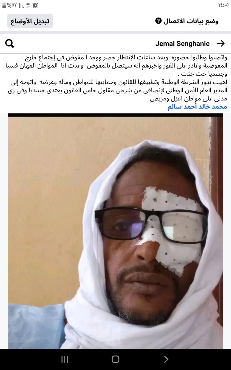 أهيب بدور الشرطة الوطنية وتطبيقها للقانون وحمايتها للمواطن وماله وعرضه واتوجه إلى المدير العام للأمن الوطنى لإنصافى من شرطى مقاول حامي القانون يعتدى جسديا وفى زي مدنى على مواطن اعزل ومريض