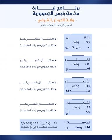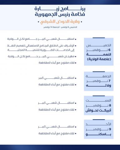 البشام الإخباري/ برنامج زيارة فخامة رئيس الجمهورية، السيد محمد ولد الشيخ الغزواني، لولاية الحوض الشرقي، ابتداء من يوم غدٍ الخميس وحتى الجمعة 14 نوفمبر 2025