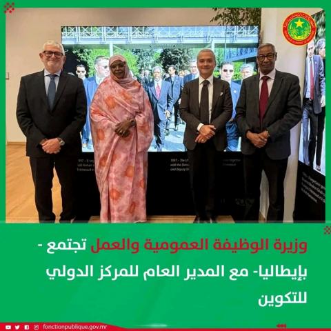 البشام الإخباري/ عقدت معالي وزيرة الوظيفة العمومية والعمل السيدة مريم منت بيجل ولد هميد اليوم الخميس 10 اكتوبر 2025 - على هامش المؤتمر الدولي للرقمنة ومستقبل العمل المنعقد بإيطاليا - اجتماعا مع السيد اكريستوف بريه المدير العام للمركز الدولي للتكوين التابع لمنظمة للعمل الدولية.