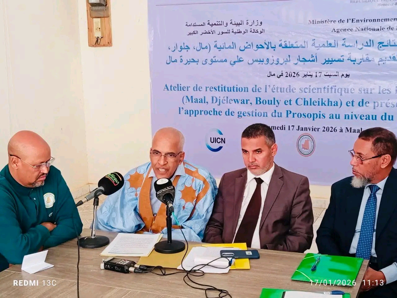 من جانبه، أوضح المدير العام للوكالة الوطنية للسور الأخضر الكبير، السيد سيدنا ولد أحمد لعل، أن هذه الورشة تعكس التوجه القائم على الاعتماد على العلم والتخطيط السليم والعمل التشاركي مع الجماعات المحلية، مشيراً إلى أن الدراسة بينت أن المناطق الرطبة تمثل عنصراً أساسياً في حياة السكان المحليين، لكنها تواجه ضغوطاً متزايدة نتيجة تدهور الأراضي وتراجع الموارد الطبيعية وانتشار النباتات الغازية، وعلى رأسها شجرة البروصوبيس، التي تؤثر سلباً على التوازن البيئي والأنشطة الزراعية والرعوية.