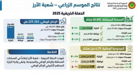 كما ارتفعت المساحات المستغلة في زراعة الأرز لتصل إلى 48.800 هكتار خلال الموسم الحالي، مقابل 44.864 هكتار في موسم 2024، أي بزيادة قدرها 9 في المائة، وبنسبة 24 في المائة مقارنة بمتوسط خمس سنوات، الذي بلغ 39.400 هكتار.