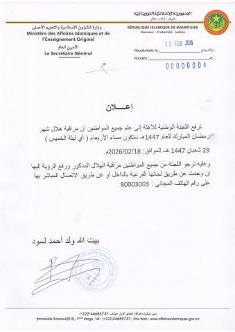 دعت اللجنة الوطنية للأهلة لمراقبة هلال شهر رمضان المبارك للعام 1447هـ ستكون مساء الأربعاء ( ليلة الخميس ) .