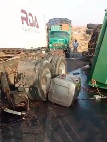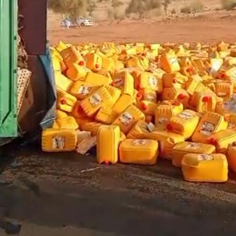 البشام  الإخباري  / تسبب سقوط شاحنة للبضائع محملة بزيت الطعام  على طريق الأمل شرقي ابي تلميت على بعد حدود 25كم في سد طريق الأمل كما تسبب نفس الحادث في تصادم شاحنتان  للبضائع  في نفس الاتجاه  وبحسب مراسل البشام الإخباري من عين المكان فإن